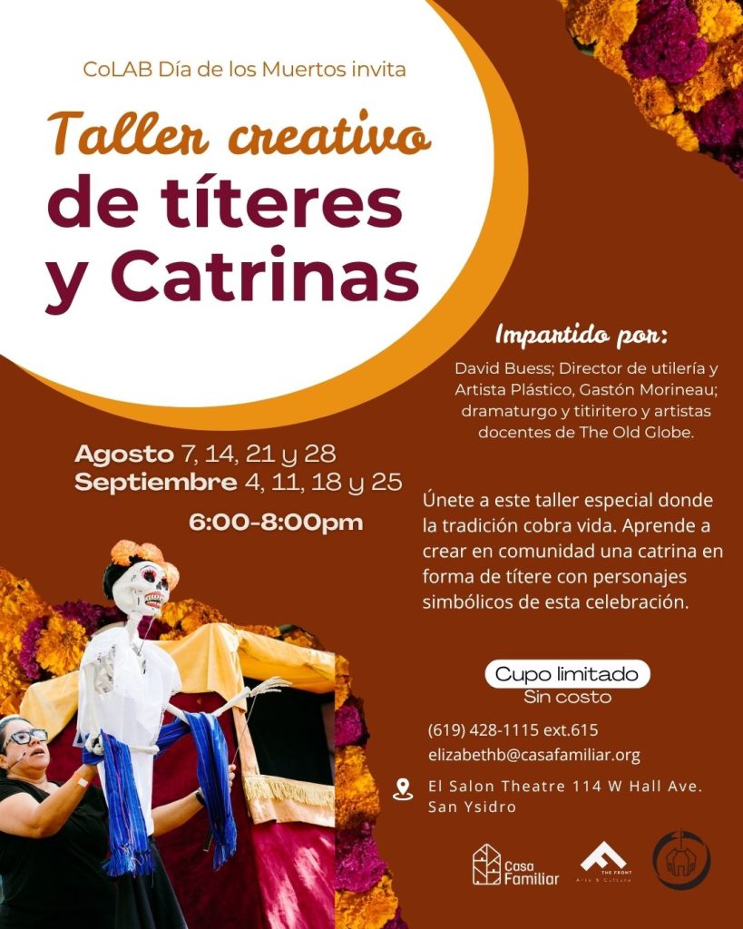 En colaboración con The Old Globe San Diego, te invitamos a un taller especial donde la tradición cobra vida. Aprende a crear tu propia catrina en forma de títere junto al director de utilería David Buess y el dramaturgo y titiritero Gastón Morineau. Además, acompaña el proceso creativo escribiendo historias personales inspiradas en el Día de Muertos, guiado por profesionales del teatro.
