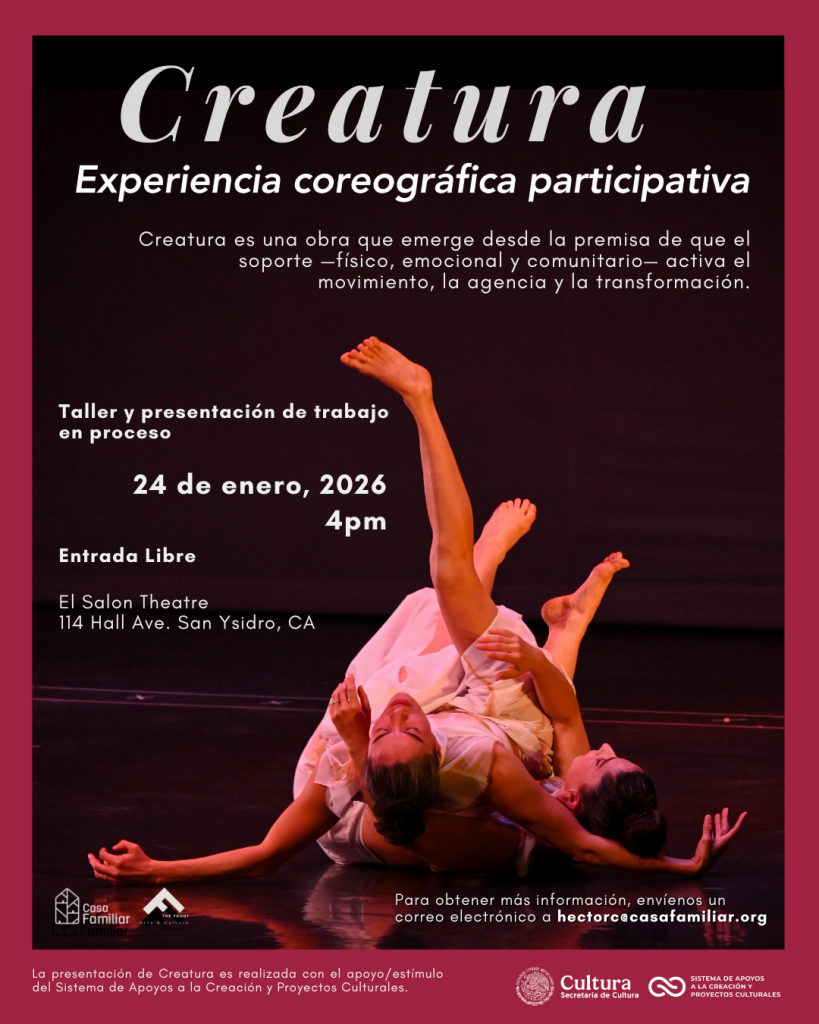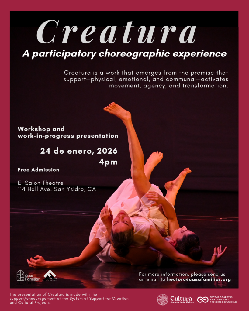 «Creatura,» is a research project by choreographers Miroslava Wilson and Briseida Lopez, who, through their collaboration, have developed research guidelines that combine somatics, dance, and philosophy to create a new performative-choreographic piece. During this recent period, they completed a creative residency in collaboration with El Salón and Casa Familiar. This experience is a presentation of part of that creative residency.