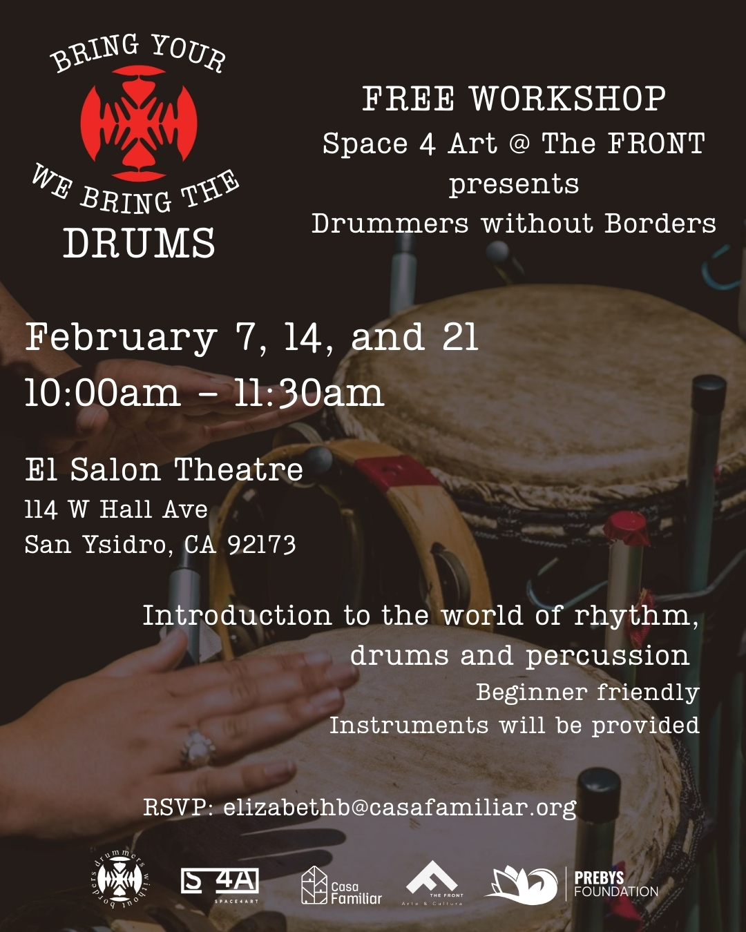 Bring your hands, we’ll bring the drums! Join Drummers Without Borders for a beginner-friendly introduction to rhythm, drums, and percussion. No experience needed and instruments are provided. Feb 7, 14 ...